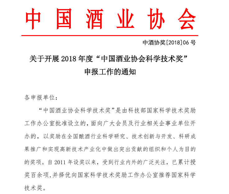 “中国酒业协会科学技术奖”是由科技部国家科学技术奖励工作办公室批准设立的,面向广大会员及行业相关企事业单位开办的,以奖励在全国酿酒行业科学研究、技术创新与开发、科研成果推广和实现高新技术产业化中做出突出贡献的组织和个人为目的的奖项。自2011年设奖以来,受到行业内外的广泛关注,已累计授奖百余项,并择优向国家科学技术奖励工作办公室推荐国家科学技术奖。